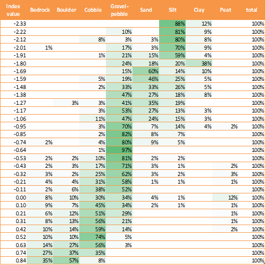 The four hydromorphological indices represent major dimensions in the distribution of hydromorphological features derived from RHS data. The following figures illustrate, for each index (x scale), the relative occurrence of constituting morphological features in percentage. The indices and figures were built using RHS semi-natural sites with little or no signs of channel/bank modification. For example, on the Channel Substrate Index figure and table below, a CSI score of -2.33 is associated with sites generally composed of silt (88%) and/or clay (12%).