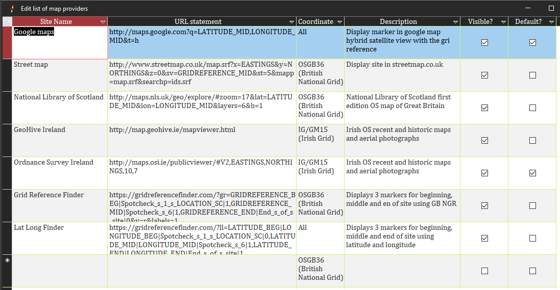 The dropdown box above the 'Show on map' button offers you a choice of online providers for displaying your site. The list provided is a function of the coordinate system and geographical location. You can edit the list and add online providers. To do so, click on the edit icon that will appear at the bottom of the list and a form will open. Then: