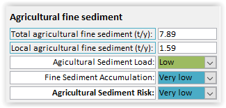 Total agricultural fine sediment delivery represent all fine sediments transported from upstream in the water column and local sediment delivery through run-off and tributary inputs. The data are derived using modelling but can be entered by hand by the user.
