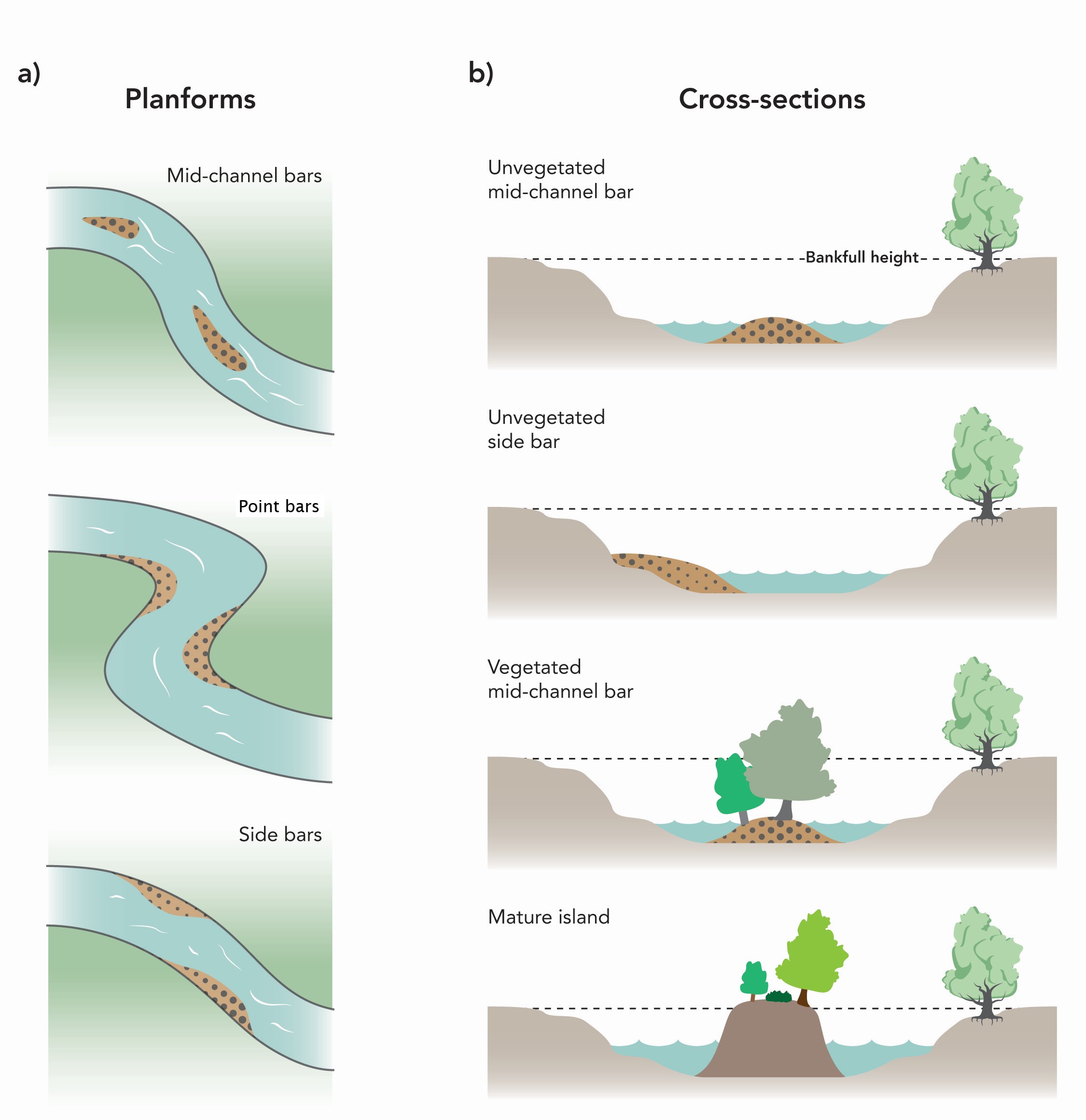Constituent material comprising teh bars is as for unvegetated point bars.