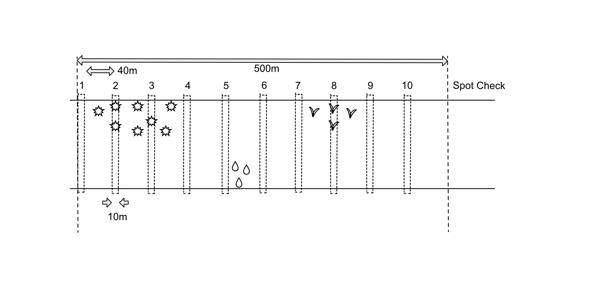 Illustration showing that vegetation in the spot checks is not the same as summation over the entire 500m of the survey length.
