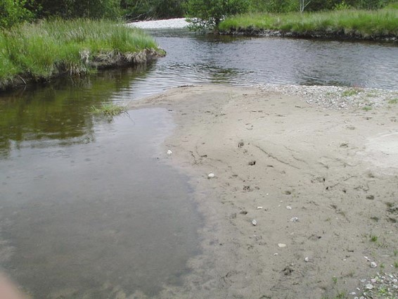 A discrete unvegetated sand deposit is either underwater or exposed, in the channel or on the margins with a minimum size of 5m2. DO NOT RECORD when sand covers the bed from bank to bank (recorded as ‘SA’ in Section G) – the deposits must contrast with the predominant river bed substrate(s). Discrete sand deposits are often formed in response to obstructions (e.g. fallen tree, naturally protruding boulders or artificial deflector structures), or in recesses in banks. Discrete sand deposits are recorded because they are valuable habitats for several invertebrate species. As sand deposits are not considered to be ‘discrete’ if they are present along more than 33% of a site (sand would be a predominant substrate in Section G), it is not possible to record extensive discrete sand deposits (‘extensive’ box not on the form).